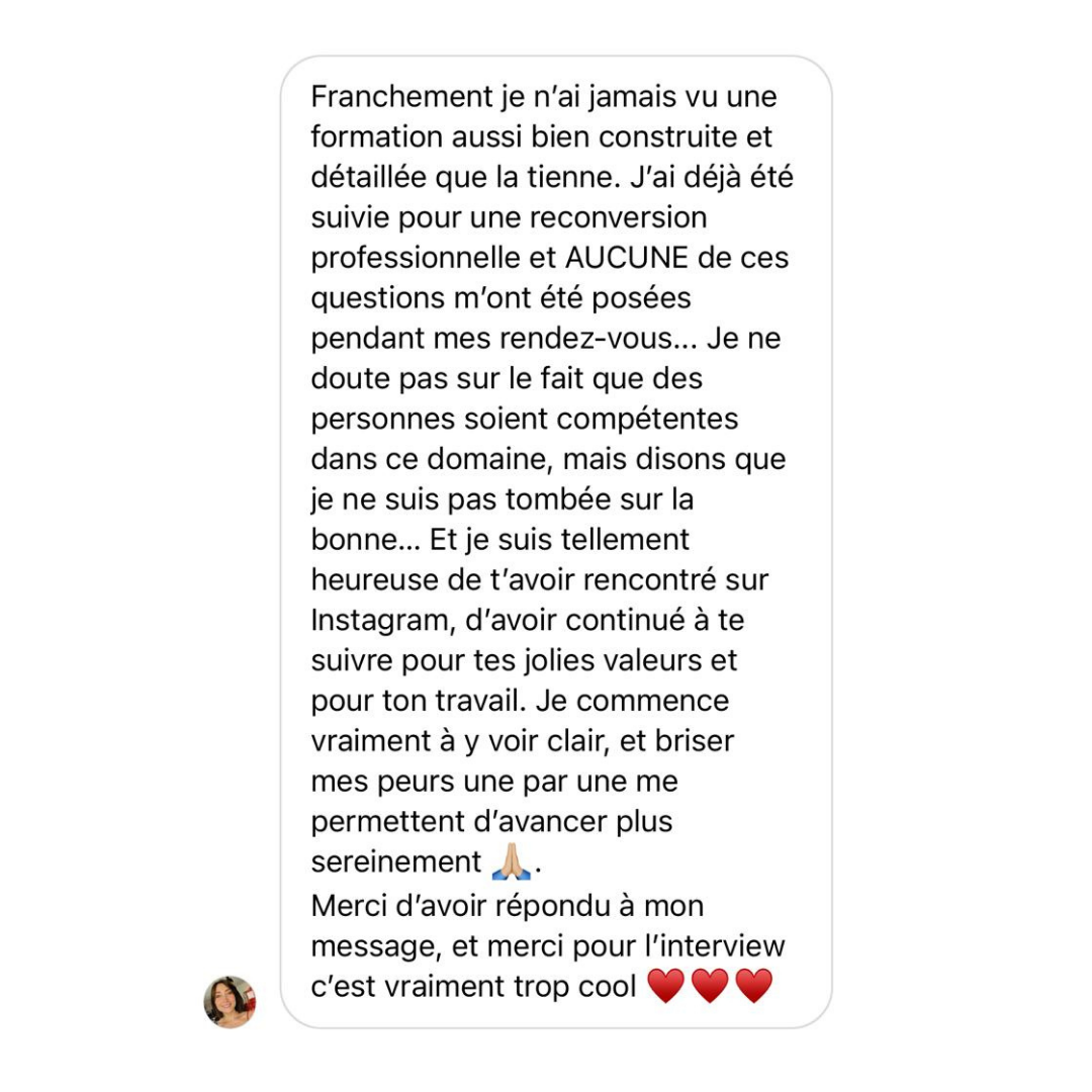 - Tu sois rassuré(e) (sur la partie diplôme, sécurité financière et confiance en toi)